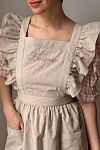 Нарядный фартук с рюшами и вышивкой из 100% хлопка. Размер регулируется с помощью потайных пуговиц. Два вместительных, глубоких кармана. Стильный аксессуар для любителей готовить, рисовать, или лепить из глины.