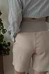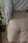 В бежевом цвете шорты выполнены изо льна двойного умягчения, поэтому ткань мягче и ощущается тоньше.